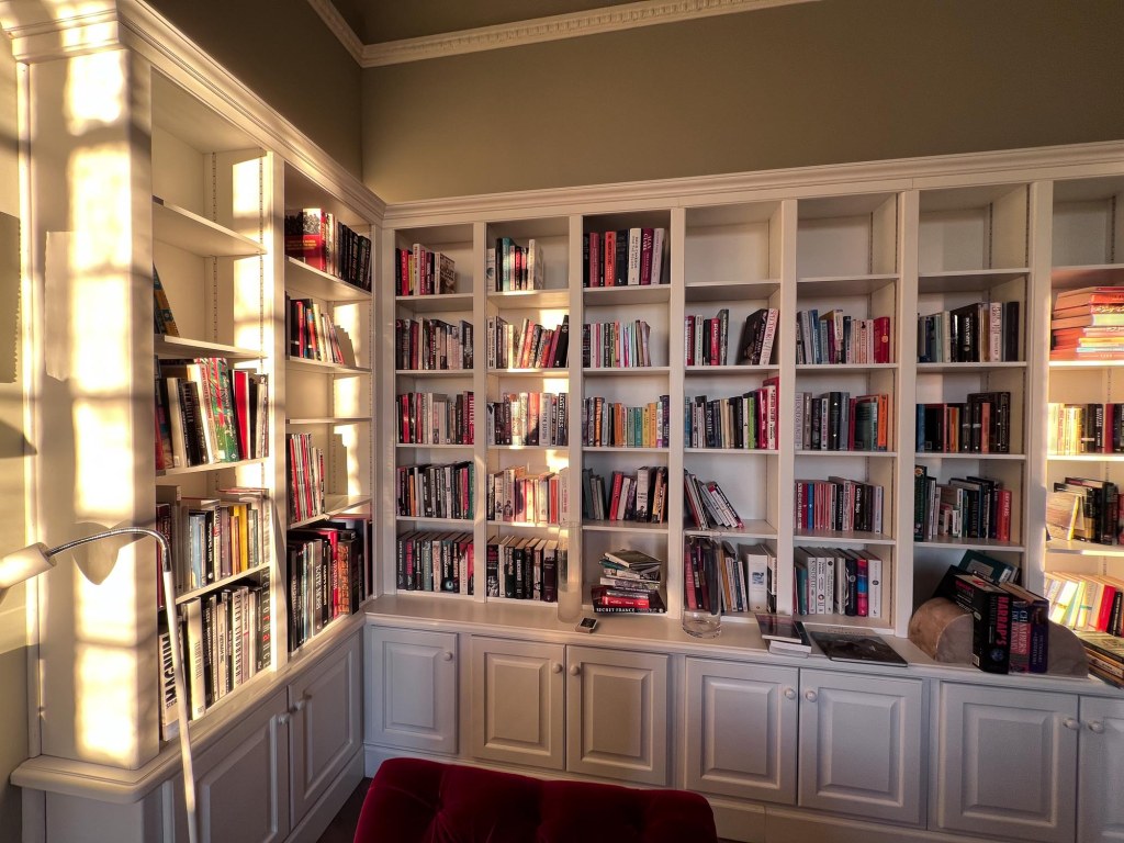 First priority, now that the new floors in the library and salon have been finished, was to get the books back onto the shelves of the library. This time we’ve managed to impose a little order into the arrangement but it’s still an eclectic selection.