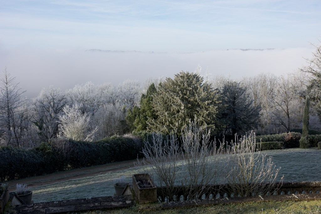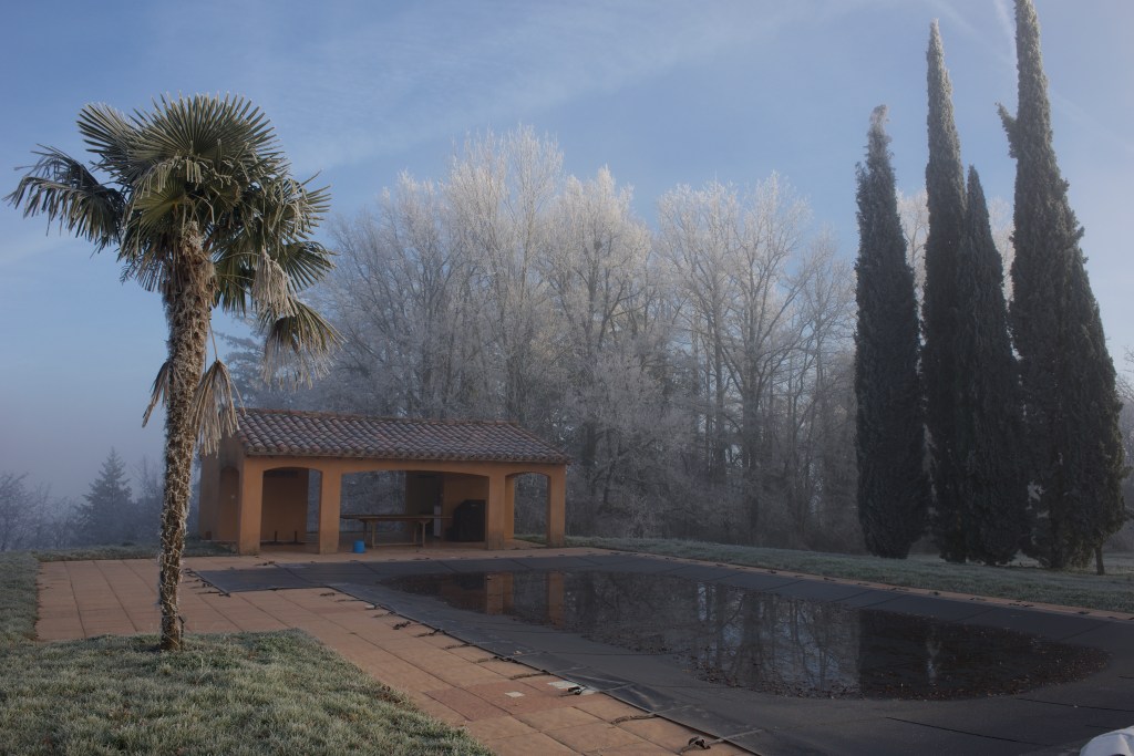 Happy New Year to everyone! It’s pretty cold across most of Western Europe right now and Najac is no exception but we went for a warming mug of spiced hot red wine in the village on New Year’s Eve and now we’re snug in the house. A side effect of the cold snap are some spectacular landscapes, entirely covered by frost. No danger of that in the Summer of course…